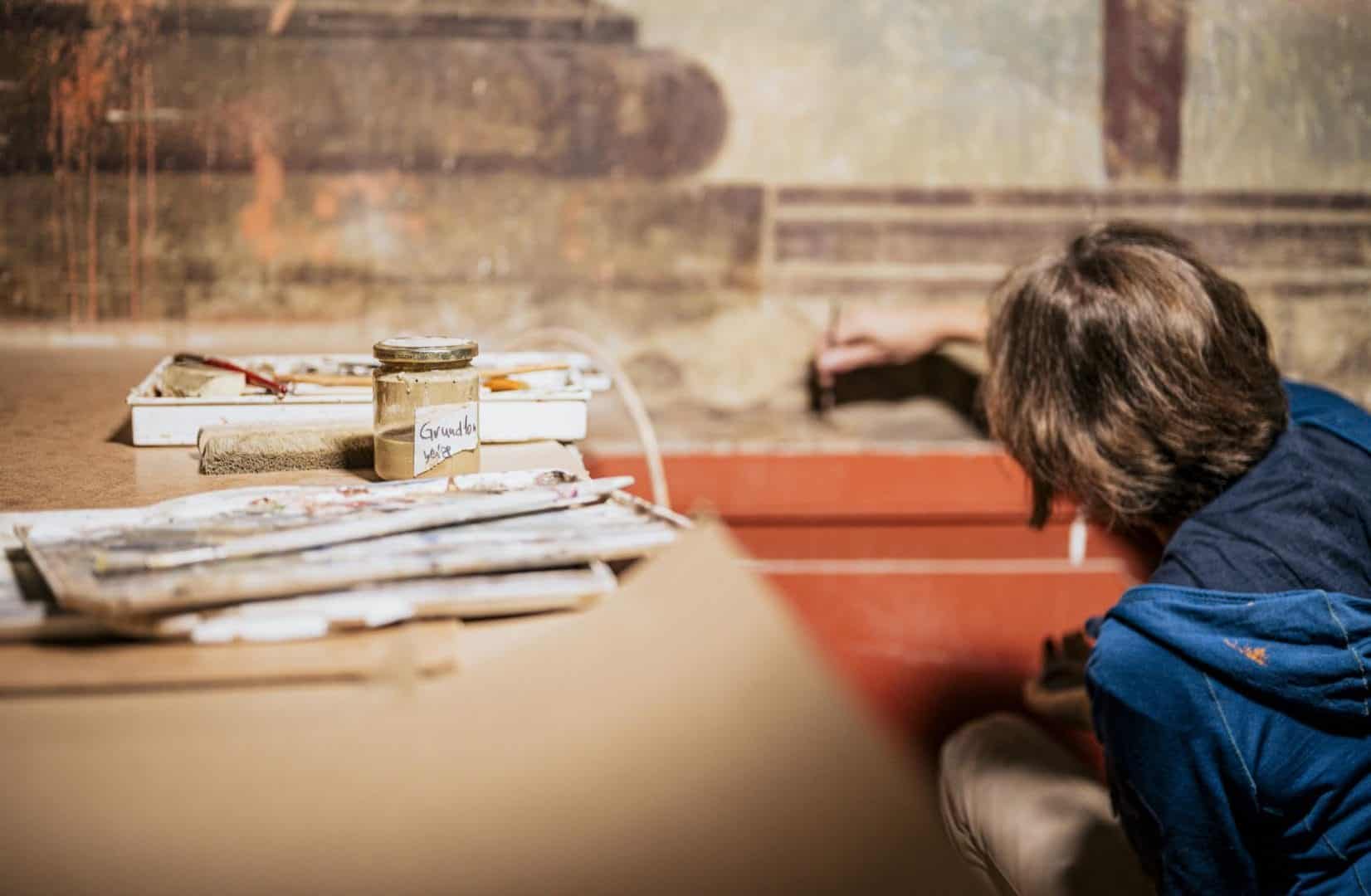 Die Restaurierungsarbeiten übernahm der erfahrene Restaurator Markus Schmidt, der gemeinsam mit seiner Kollegin seit dem 1. Juli an der behutsamen Freilegung und Konservierung der Bilder arbeitet. Besonders herausfordernd ist der Zustand der rechten Wandmalerei (Kairo): Durch jahrzehntelange Feuchtigkeitseinwirkung sind rund ein Viertel des Motivs unwiederbringlich verloren. Die beschädigten Bereiche werden daher nicht rekonstruiert, sondern mit Erdfarben in ähnlicher Farbgebung optisch angepasst – so bleibt die Authentizität des Werkes erhalten.
